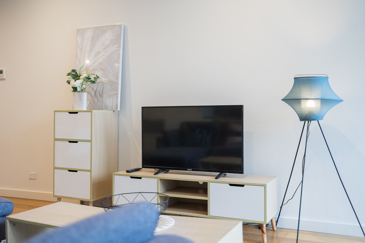 Relax in a cozy, well-appointed bedroom with a plush king-sized bed, soft linens, and ample storage space. The apartment features a spacious living area with a smart TV and free Wi-Fi, perfect for unwinding after a busy day. The fully equipped kitchen allows you to prepare your favourite meals, while the sleek bathroom provides all the essentials for a refreshing start to your day.